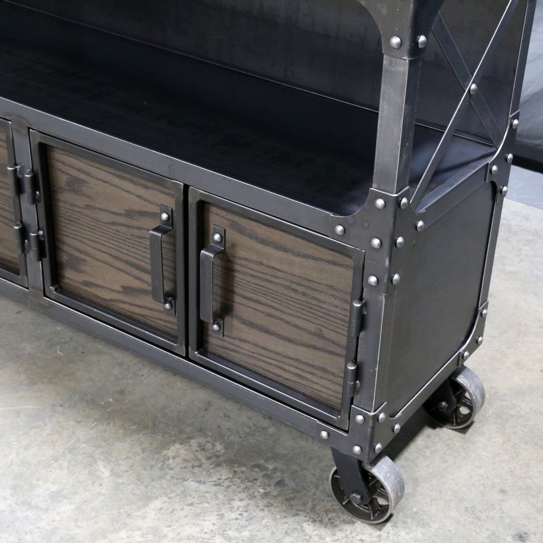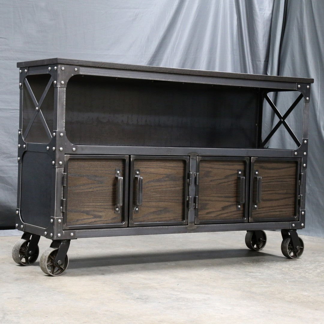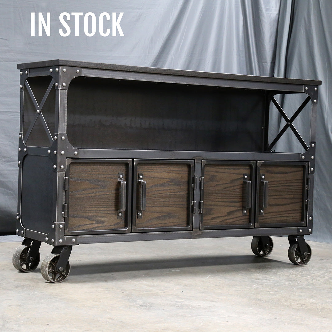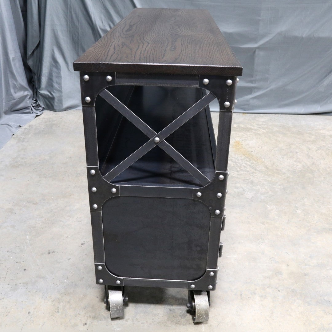 This beautifully crafted piece combines Modern Industrial style with functionality, featuring a solid wood top made from American oak and an open area below.