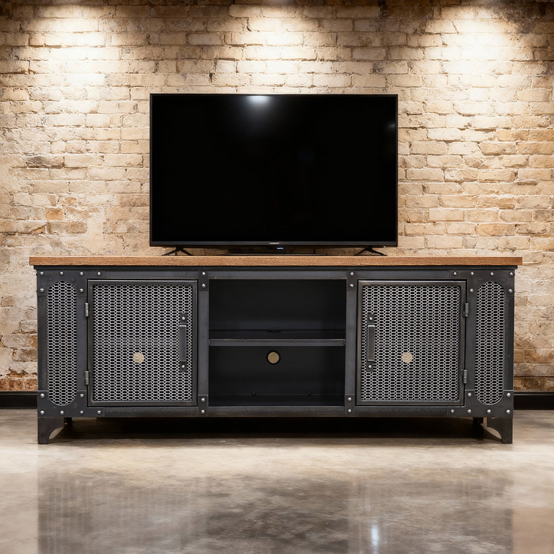 The Carnegie media console combines industrial style with practical features like pre-cut holes for cables and remote control compatibility. Its strong, sleek design fits perfectly in any room, offering durable and convenient media storage that enhances your space effortlessly.