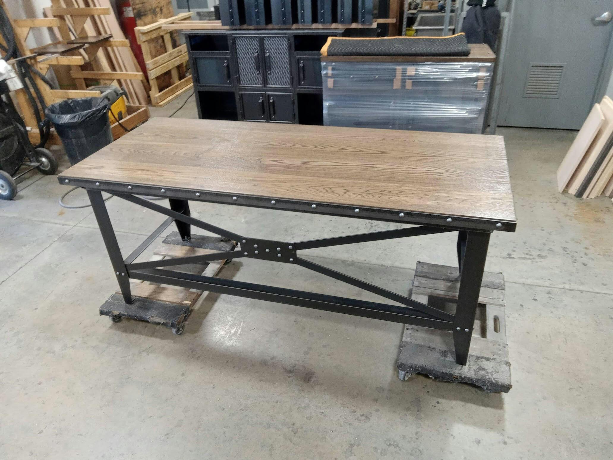 The "Machinist" desk is a solid piece of American industrial iron with its heavy angular legs and solid wood top. The solid rivets and steel construction are reminiscent of early 1900 architecture and steel bridges.