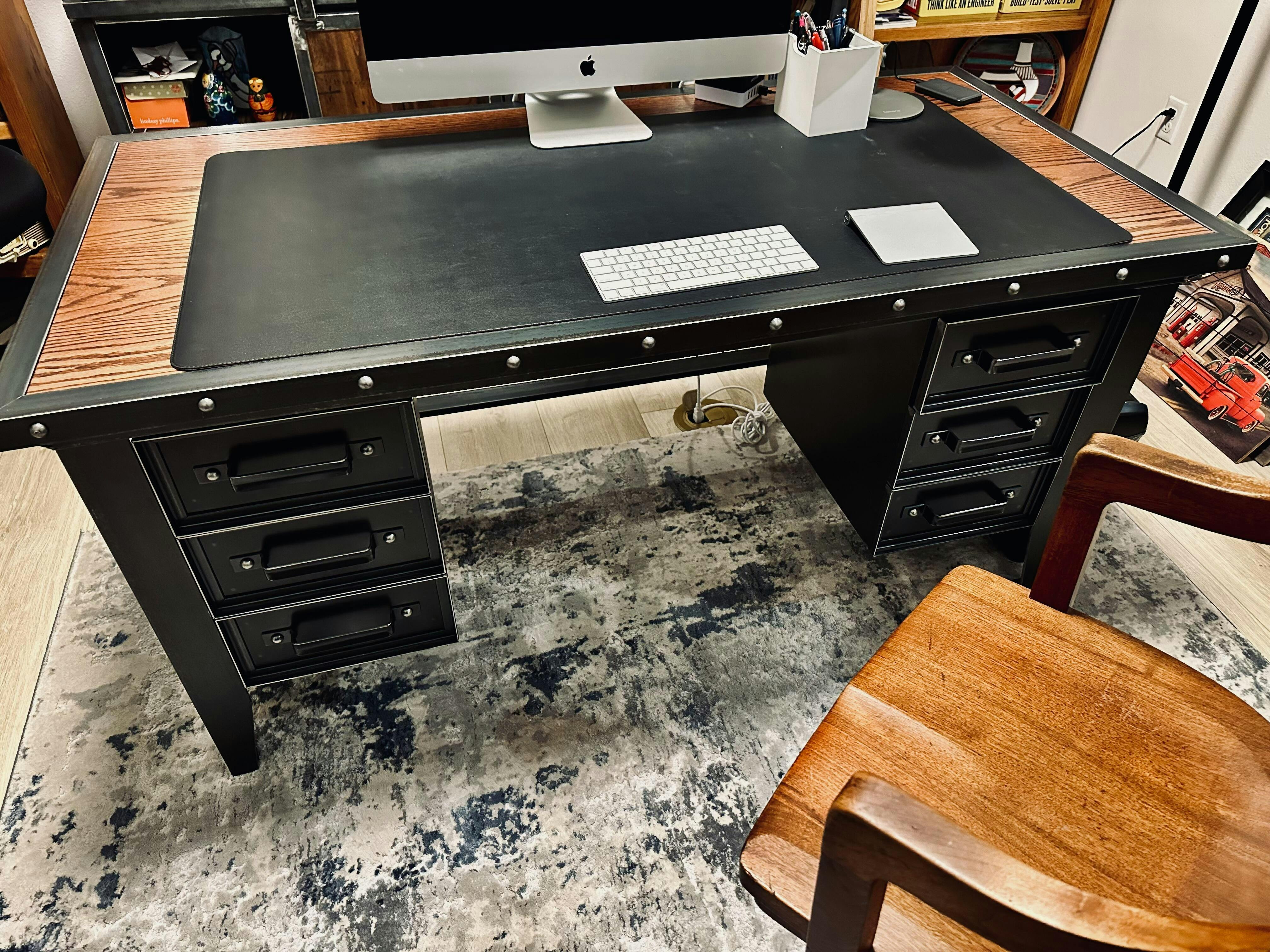 This Machinist desk is a solid piece of American industrial iron with its heavy angular legs and solid wood top. Features a set of drawers on each side, configuration can also be with 1 small drawer plus 1 file cabinet drawer.