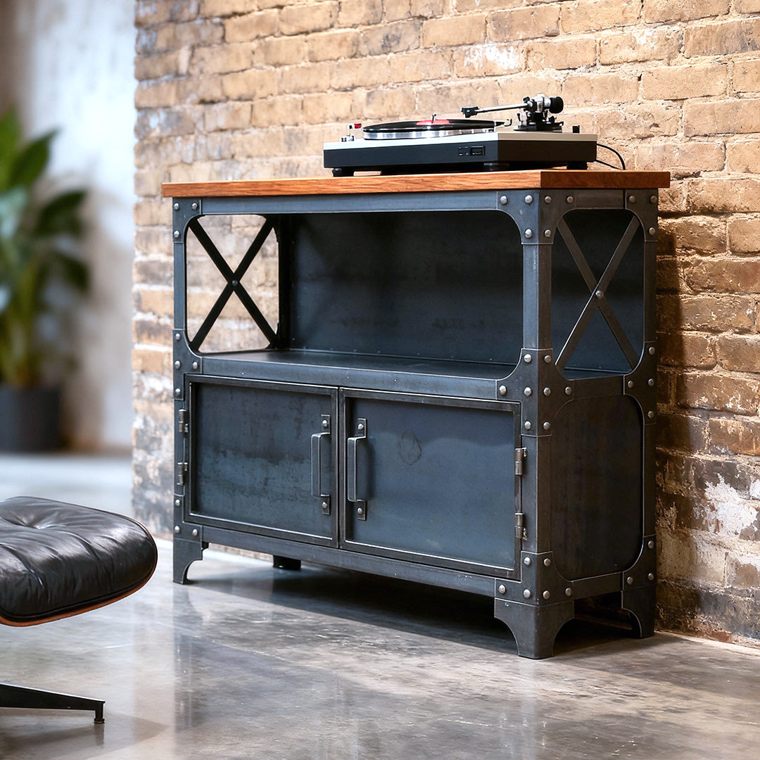 Introducing the Java, the ultimate vinyl record turntable station for showcasing your music collection in style. This beautifully handcrafted piece blends Modern Industrial design with functionality, featuring a solid American oak top that’s perfect for your turntable setup and an open space below to display your favorite records or audio equipment.