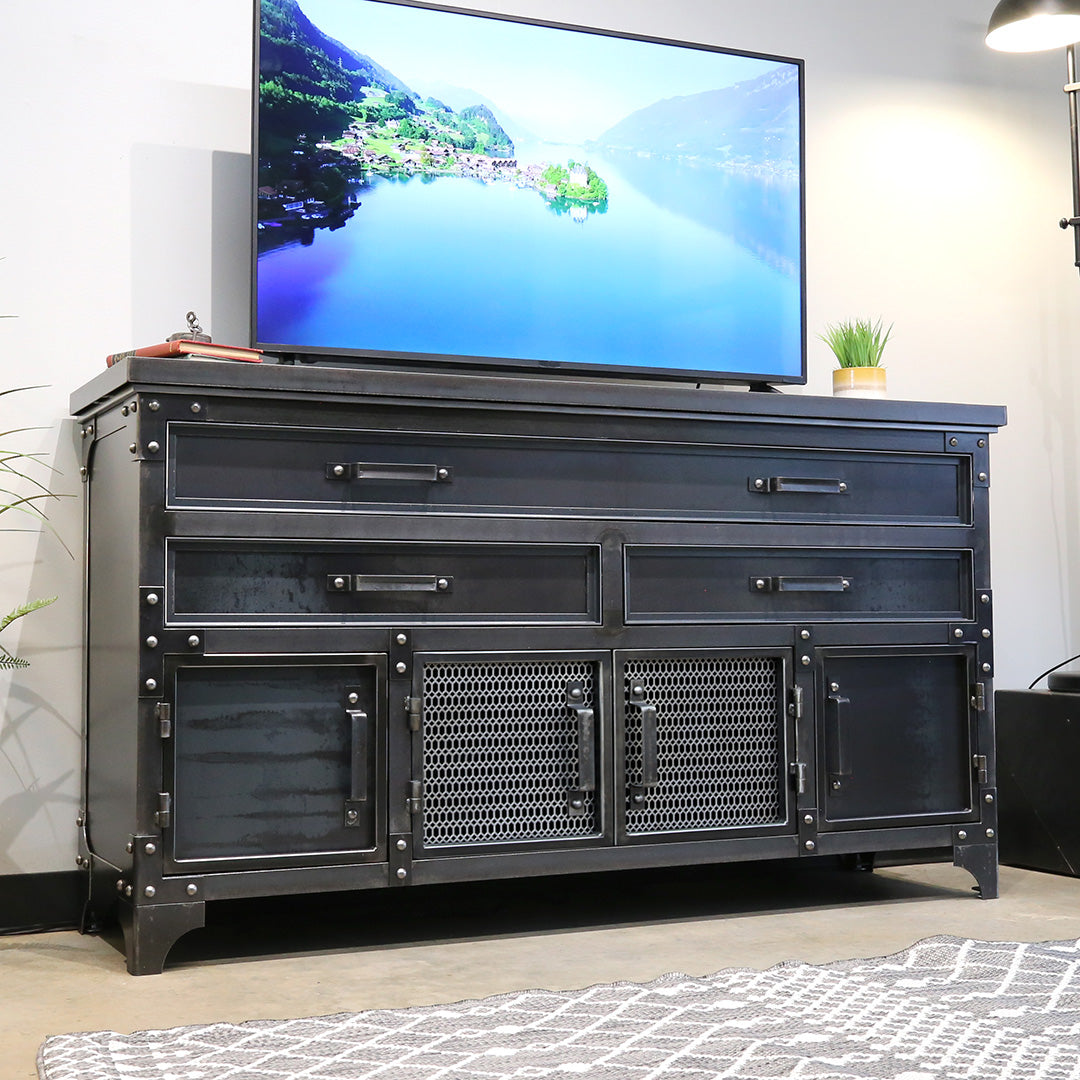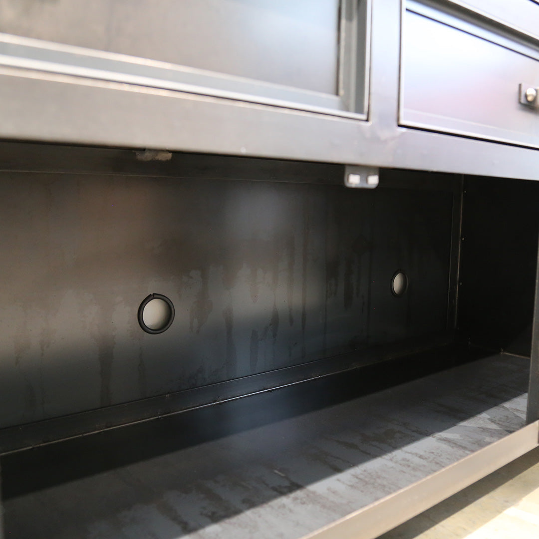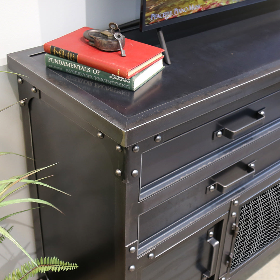 The top half features drawers for storage, while the lower half includes a media console compartment, making it the perfect addition for any game room or home entertainment setup. The protective clear coat finish highlights the richness and strength of hot rolled steel, while the ball bearing drawers open smoothly and quietly.