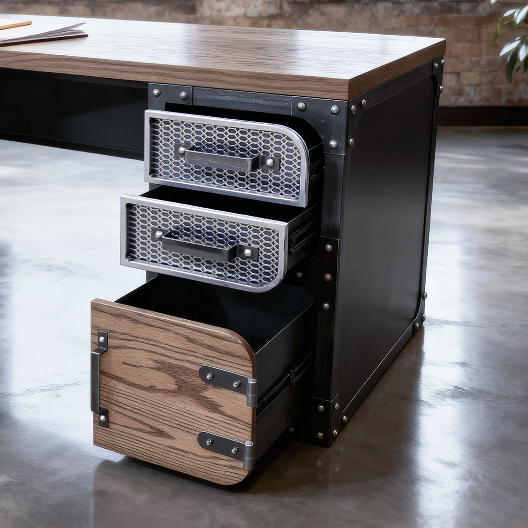 Transform your workspace with our one-of-a-kind Courier Desk. It boasts an eye-catching combination of modern industrial style and fine craftsmanship. Specially built for the ever-changing work life, this desk offers the perfect blend of aesthetics and utility.